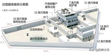 9•11后。本•拉登一直藏匿不出。美国中情局发现他可能隐藏在巴基斯坦一个叫阿伯塔巴德的地方。住在带独立院子主建筑为三层楼的别墅里。据中情局的评估报告。本•拉登住在主屋(位于A区)的三楼。他的儿子哈立德住在二楼。一楼住着本•拉登的亲信阿布拉尔•库瓦提及其家人。本•拉登的信使艾哈迈德•库瓦提和他的妻子以及孩子住在C区的客房里。楼内可能还有本•拉登一至两个妻子和十几个孩子。
