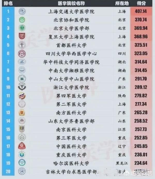 医学院的前十大概是北京协和。北医。复旦医学院。上交医学院。川大华西。华科同济。中山大学中山医。中南湘雅。吉大白求恩。山大齐鲁。其它都是本省为王。