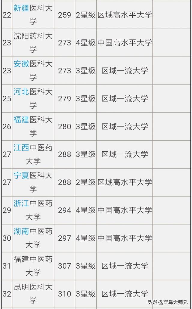 大家看看这个排名前二十的医学类的大学。有基本上一半是世界一流学科建设高校。其实力还是比较强的。这里面菜鸟提一下黑龙江中医药大学。这所高校虽然不是一流学科建设高校。但其中药学却是第四轮学科评估的A级学科。大家如果有兴趣可以看看。这也是非常不错的一所医学类的高校。