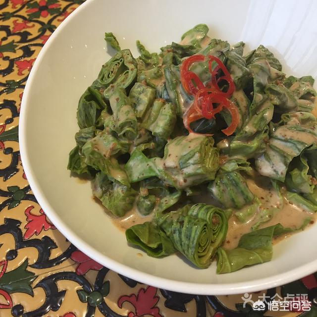 凉拌莲藕叶是用刚刚萌发、还打着卷的小荷叶。切段后。横截面错落有致。极富线条感。配上特制的酱汁。酱香味裹挟着莲叶本身的清香。微苦。是大自然的味道。