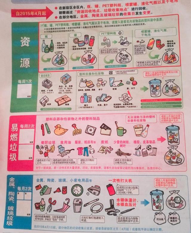 对于刚去日本生活的人来讲。每天得花费不少时间在处理垃圾上。挺头疼的。就算是游客。如果是住民宿。也要按照民宿的垃圾处理手册来分类。垃圾主要分为了七类。住酒店则容易多了。不用自己分类。因为酒店是有垃圾处理费的。