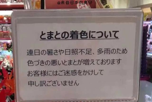 日本人比较喜欢把“不好意思”挂在嘴边。感觉一天到晚在表示道歉。在日本超市里第一次看到有类似道歉的标示:因为天气不好。番茄的颜色不太好看。给顾客带来了困扰。实在是不好意思。