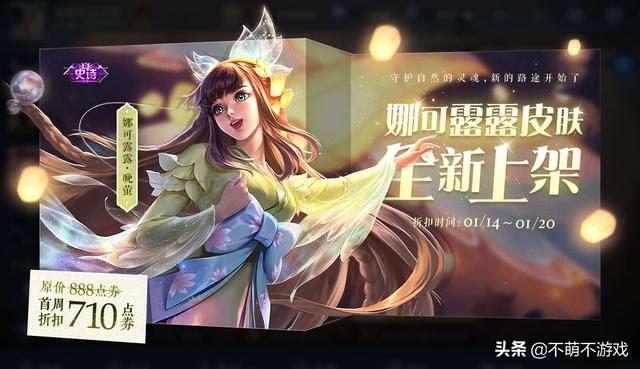 至于我们的首款SNK英雄娜可露露的皮肤晚萤。以萤火虫色为主色调。半透明的羽纱材质让娜可露露充满灵动之感。有种少女心爆棚的感觉。而且王者大大们为了显示自己的诚意。晚萤上架首周折扣价仅有710点券。可谓是相当划算了。