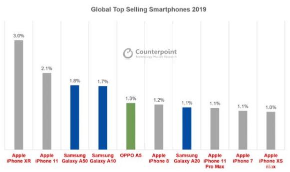数据上我们可以看到上榜的品牌多以iPhone以及三星机型居多。唯一上榜的国产品牌是小米旗下的红米Note9pro。看到这肯定有人会有所疑问。在国内销量排名第一远超其他品牌的华为为什么没有机型上榜呢?而且就算是在2019年华为正值巅峰的那一年。全球销量排名前十的手机中也没有华为手机的身影。如下图所示。那一年上榜的国产机型是大家基本没听说过的OPPO A5。