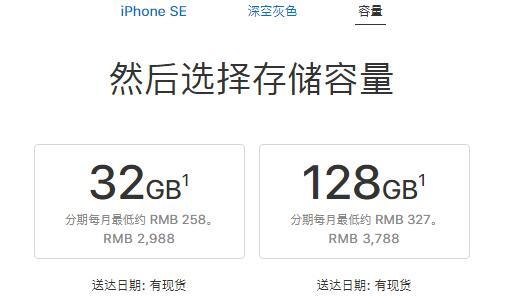 价格方面。iPhone SE目前只有32GB和128GB两个版本。32GB 2988元。第三方平台2799元。128GB 3788元。第三方平台大多没有128GB版本。不过一般用户使用32GB存储空间足够。