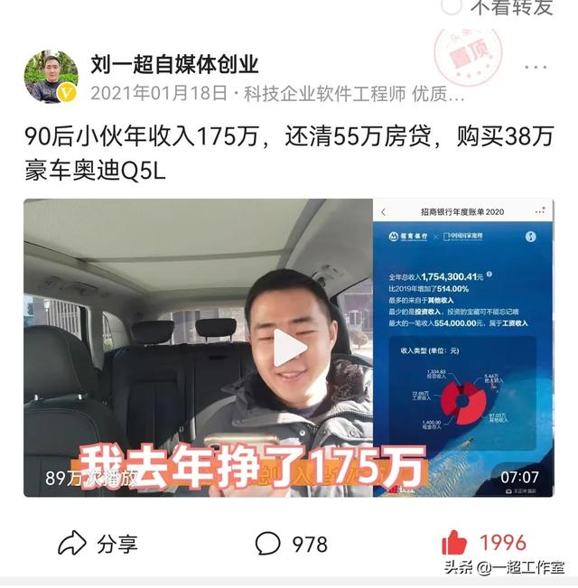 整个2020年。大大小小的项目接了很多。小一点的10几万。大一点的20-30万。一年下来挣了175万。这就是我依靠自媒体赚到的第一桶金。这一年确实我确实收获很多。我把55万的房贷一次性还清了。而且还买了一辆奥迪车。