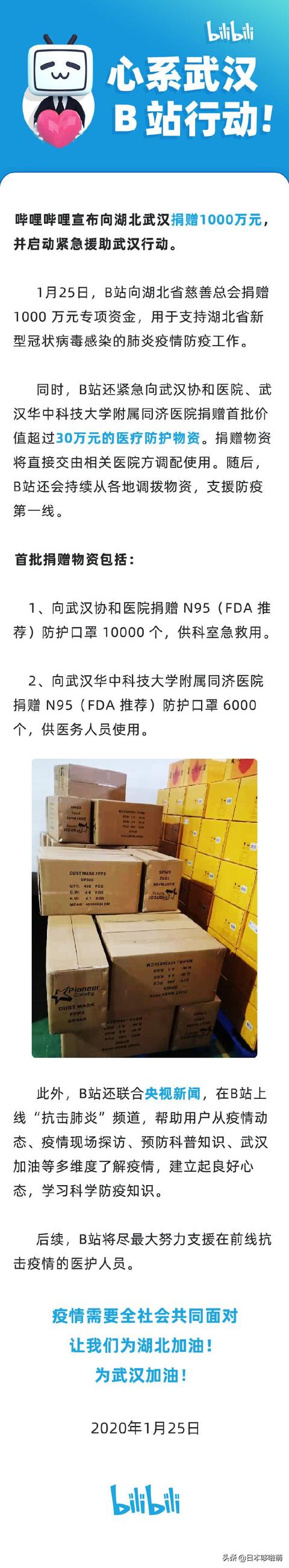B站向湖北武汉捐赠1000万元。同时向武汉协和医院捐赠N95防护口罩10000个。向华中科技大学附属同济医院捐赠N95防护口罩6000个。