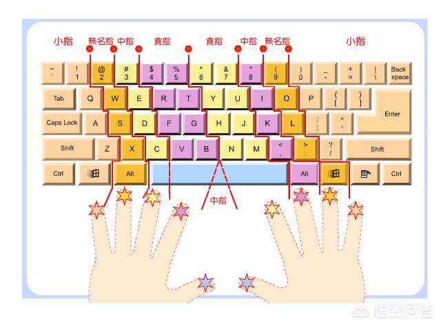 打字时双手的十个手指都有明确的分工。只有按照正确的手指分工打字。才能实现盲打和提高打字速度。