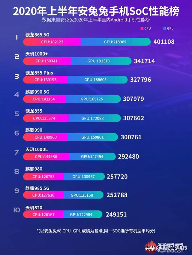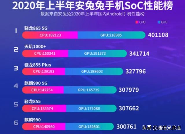 从安兔兔2020年上半年手机SOC性能排名来看。天玑1000+的跑分高达341714。排行第二。仅此于高通骁龙865 5G。骁龙855 Plus和海思麒麟990 5G分别排名第三、第四名。