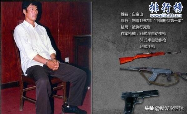 前两位以残忍变态的杀人手法上榜。白宝山则是纯粹的“杀人高手”。中国十大杀人狂魔中最“纯粹”的一位。白宝山持有“五六”式半自动步枪、“八一”式自动步枪、“五四”式。先后杀害军人、警察和无辜群众15人。击伤15人。并在狱中杀害2人。公安机关先后协调多省市公安部门。出动数万军警。长达一年半的时间才白宝山抓获。