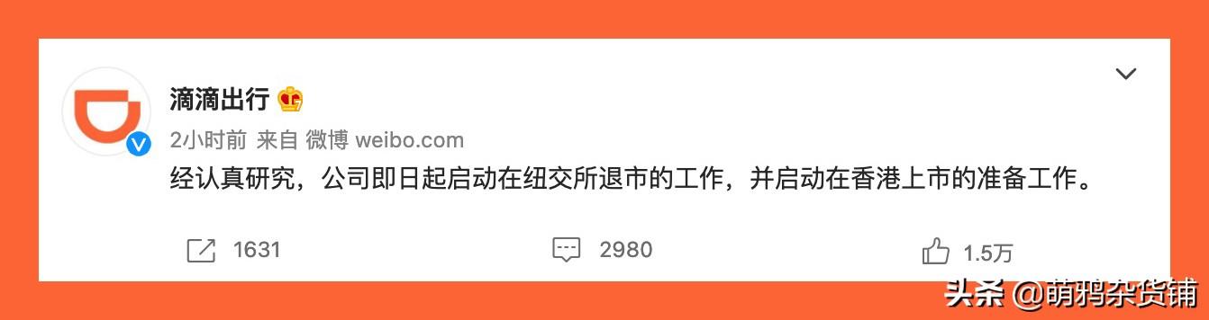 滴滴官方微博12月3日早上发布消息:经认真研究。公司即日起启动在纽交所退市的工作。并启动在香港上市的准备工作。