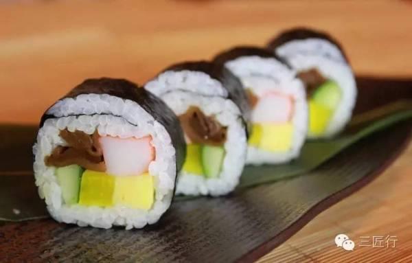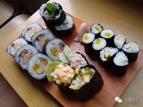 卷寿司也是一种中国人非常熟悉的寿司。在小竹帘上铺上一层海苔或者紫菜。再铺一层米饭。中间放上配料。卷起来成一长卷。然后切开成小段。