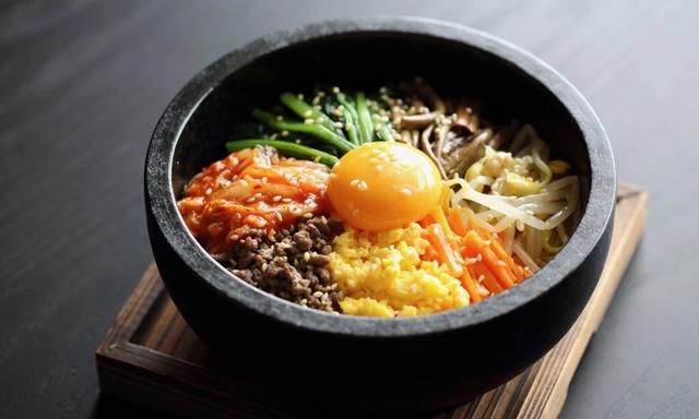在滚烫的石锅中加入菠菜。黄豆芽。蕨菜。金针菇等等。浇上韩式辣酱和辣白菜。配上一颗新鲜的半熟鸡蛋。趁热搅拌。大口大口吃。还有什么能抵抗的呢?