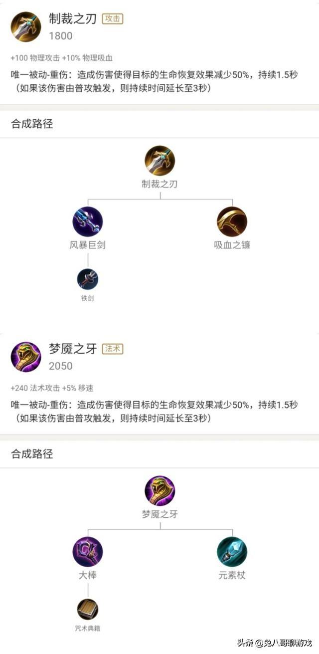那么这两件装备主要作用就是一个遏制能力。都知道在一场对局中。续航能力是保证自己能够发挥多大作用的主要条件。而增加自身续航能力的方式也有很多种。同时也有一些英雄的技能特性同样会有回复能力。所以这两件装备主要的功能就是遏制那些有强大回复能力的英雄。以便阻止这样都英雄造成更多的伤害。