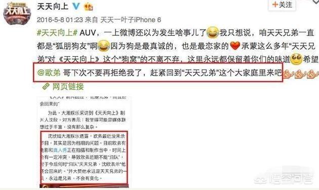 我是湖北人。你知道。我们小时候都只能看湖南卫视。湖南经视的!于是很早之前就开始喜欢汪涵。特别是他的《越策越开心》。后来出现《天天向上》也特别喜欢看。从天天向上里面认识了欧弟。才知道他的经历。认可他的才气。后来也渐渐喜欢欧弟。读大学的时候。天天向上是我每周必看的综艺。以前有能看到这样一群人而开心!慢慢的。队伍开始离开。从冠名商的离开。似乎天天开始走下坡路了。直到欧弟的离开。就很少看天天。不知是节目呈现的方式不喜欢。还是少了那几分调侃的梗!欧弟的离开。导致最近几年在娱乐圈能听到欧弟的消息也越来越少。怪可惜的。还是希望天天能够再次接纳欧弟!