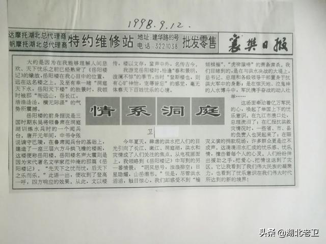 在我国。地以文名的地方很多。但我觉得最能体现此意的莫过于湖南的岳阳市了。岳阳是我国历史文化名城。文化底蕴深厚。最让岳阳市名扬天下的名片大约就是一诗一文。诗就是杜甫的《登岳阳楼》:“昔闻洞庭水。今上岳阳楼。吴楚東南坼。乾坤日夜浮。亲朋无一字。老病有孤舟。戎马関山北。凭轩涕泗流。\"文就是范仲淹的《岳阳楼记》。其中的“先天下之忧而忧。后天下之乐而乐\"已成为千古名句。我多次去岳阳旅游。领略了“洞庭天下水。岳阳天下楼\"的大好风光。1998年洪水嘶虐。亿万军民在洞庭大堤抗洪抢险。场面感人。我曾写过一篇文章。发表在我所地地区的报纸上(如下图)。今天看到此文。依然能感受到当年军民携手战胜洪灾的动人状举。