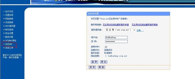 点击“动态DNS”,这时如果你的上述操作都没问题的话。服务提供者那一栏已经自动填充成花生壳的网址了。然后输入用户名。密码。点击登录。如果显示为“连接成功”。那点击“保存”。