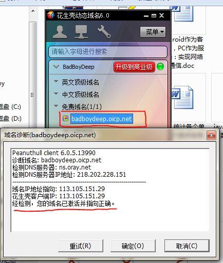 此时。我们就想有一个动态域名多好。这里给大家介绍一款软件“花生壳”。下载安装。然后注册后。你就会获得一个免费的二级域名。每次开机自启后。就会将花生壳服务端中的IP数据更新成你新的IP地址。然后你每次用你固定的域名来访问时。就会解析到你新的IP地址。