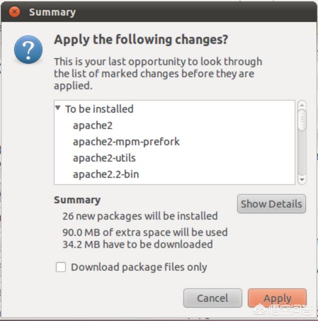 搜索并安装以下软件包名称。每个软件包名称都将包含许多先决条件:apache2。php5。php5-mysql和mysql-server。 应用更改以安装软件包。