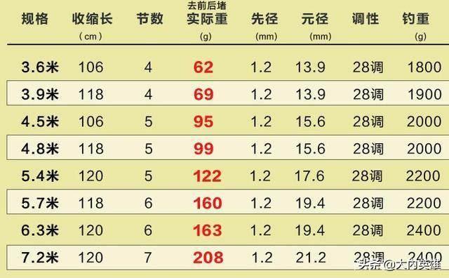 5.顶钓值(表中没有顶钓值):顶钓值代表着可以飞鱼的重量(当然这也需要看你的基本功)。这也是一项比较坑的数据。有些钓竿为了你让入坑。故意做出一个顶钓值高的数据。实际作钓过程中。会有严重的头重脚轻、镰刀头、竿身整体受力不均(不能成为一个完美的弧线)等现象。