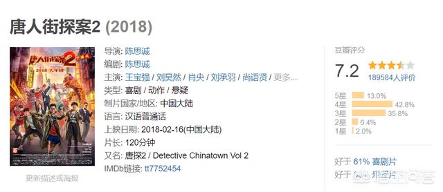 《唐人街探案2》豆瓣评分7.2。这个评分在国产片中已经很高了。我也去看了。有笑点有悬疑。剧情也比较紧凑。看起来很爽。但也不能算是很经典的喜剧侦探片。所以7.2分我也觉得非常精准。这19万人还是很能代表大众的。