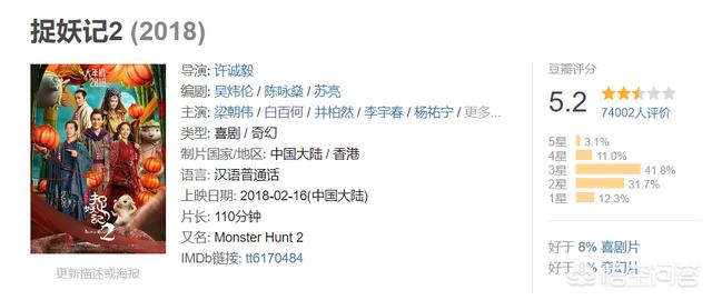 《捉妖记2》豆瓣评分5.2。属于不及格。所以首日票房虽然破了纪录。目前还是一路下滑中。已经被《唐人街探案2》逆袭了。这部电影确实是合家欢乐的喜剧片。可以看。但是剧情太简单。太缺乏电影的魅力了。5.2分我感觉非常精准!