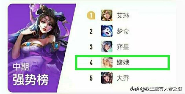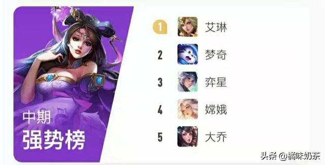 然后我们在来看中期的强势英雄排行榜。艾琳也就是老版本的后羿这个说实话排在第一过分了。还有梦琪弈星大乔等等都过分了。嫦娥应该排在第一位只有中期的嫦娥才是又肉又有输出的。第二名是上单吕布。吕布这个英雄其实中期才是最强势的特别是刚出完破军以后真的无敌伤害爆炸。后期对面射手法师都起来了相反就不怎么强势了。中期是很多战士的爆发期。像典韦曹操关羽这样的战士才是中期最厉害的。