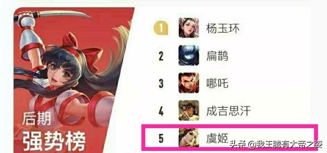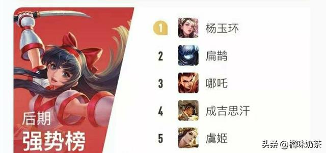 后期是射手和法师的天下。至于杨玉环排在第一我完全看不懂还有扁鹊老版本还行这个版本后期他不够格。再来看哪吒中期还算凑合。也就虞姬算是后期比较强势的。反正我觉得后期最强势的射手应该是伽罗。