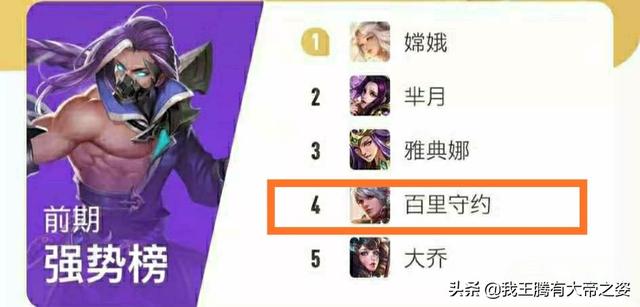 首先来看官方给的前期排行榜。我认为前期最强势的应该就是兰陵王第一名。第二名钟无艳。第三名百里守约。像嫦娥一般都是当中辅在玩。前期强度也还行但是排在第一就有的过分了。而且经常玩嫦娥的应该知道嫦娥最强势期是中期。