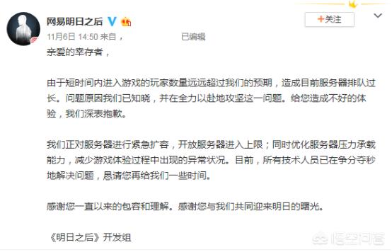 不过昨天《明日之后》开发组特意出来发声明道歉。也承诺了会优化服务器问题。技术人员也会抓紧时间解决游戏里的问题。那就说明他们对玩家还是挺重视的。至少作为一个玩家。看到了官方这种比较端正的态度。我就会觉得稍微安心点了~