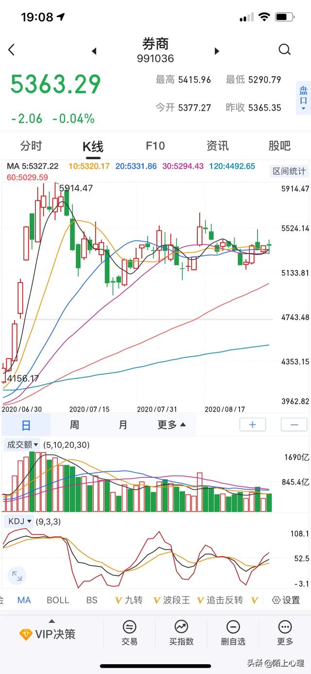 从成交量来看。证券板块放量了。而且今天很巧妙的一点。最低点刚好站在了10日均线5320点的位置。然后就企稳拉升。说明这个点位的支撑很强。
