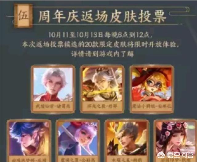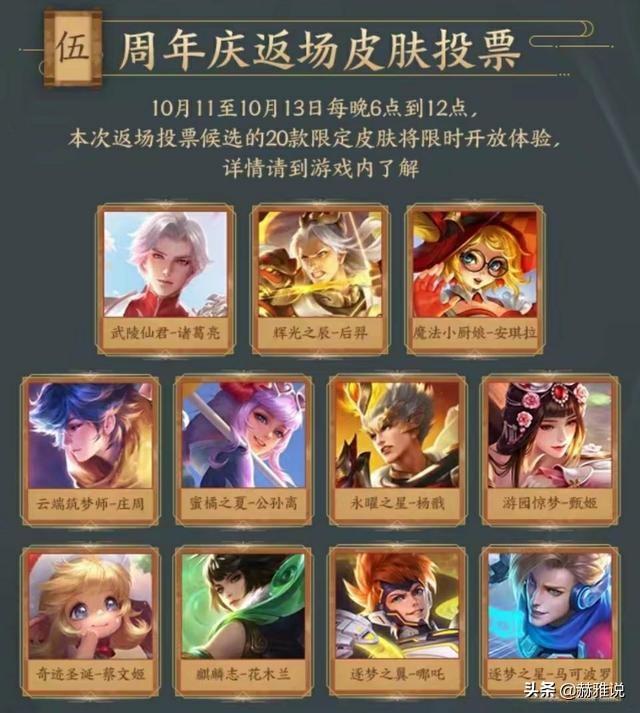 周年庆皮肤返厂时间投票已经确定了。10月11日至10月13日。到时候玩家还可以在对局里面体验这20款皮肤的效果。