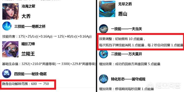 而兰陵王增加了血量。解除隐身距离从600提高到750。兰陵王的职业越发要被逼到辅助位了。二大乔只是减少技能伤害而已。对于一个辅助来说不痛不痒的。不过上周大招增加了10秒CD让后期的大乔全地图召唤的时间延长好几秒。强度多多少少会有所下降。