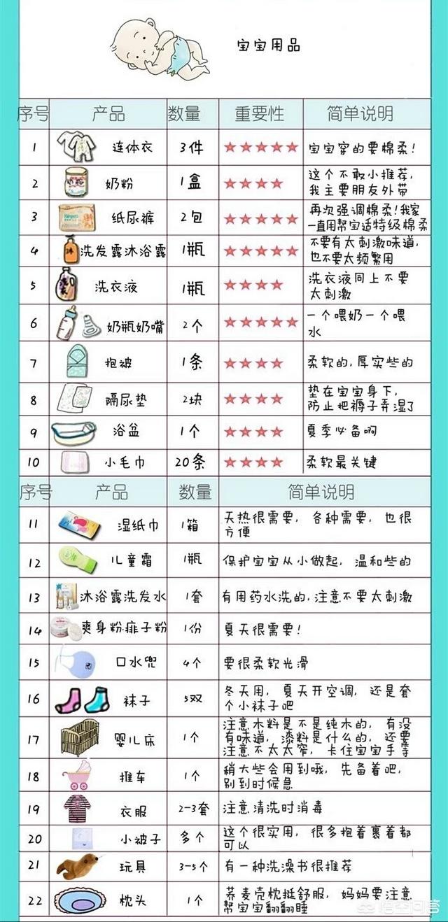 8。妈妈用的毛巾至少3条。宝宝的小毛巾也是至少3条。脸盆。医院会发的。用上两三天没问题。所以不用特意买。