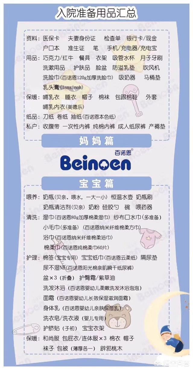 宝宝需:换洗内外衣至少三套(如果是买连体的必须买后面深开档的。最好分体。因为宝宝容易尿湿裤子。便于换洗)。大浴巾和包被每样至少两个。花王纸尿裤。湿纸巾入院要三包。护臀膏或屁屁乐一支。小方块隔奶巾至少十五六条。奶瓶消毒器或带个大汤碗那大的不锈钢锅(烫奶瓶用的)。奶瓶刷。奶粉和贝亲宽口奶瓶。小钟用于计时的。带个笔和本子。记录宝宝吃奶时间。大便次数。宝宝小袜子三双。希望我的回答能帮到你。谢谢