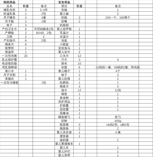 待产包需要准备产妇以及新生儿的所需品。带去医院的不用太多。产妇一般是帽子、衣服(普通对开扣睡衣两套)、袜子、棉质拖鞋、卫生纸、卫生巾、热水壶、喝水杯子(最好是吸管杯可以躺着喝)、束腹带、溢乳垫。成人纸尿裤(剖腹产用得着)。新生儿则是包被、衣物(带去医院和尚服3-5套)、尿不湿、奶瓶、奶粉等。附上自己待产准备的清单。供大家参考。哈哈!