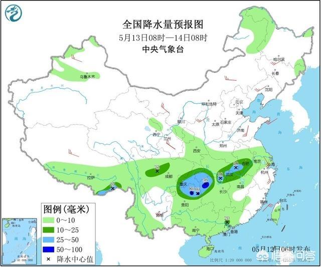 在5月13日08时至14日08时。其中湖南西部、贵州东北部等地局地区有暴雨。最强降雨量为80毫米。而在5月14日08时至15日08时时段。降雨会升级。根据中央气象台数据显示: