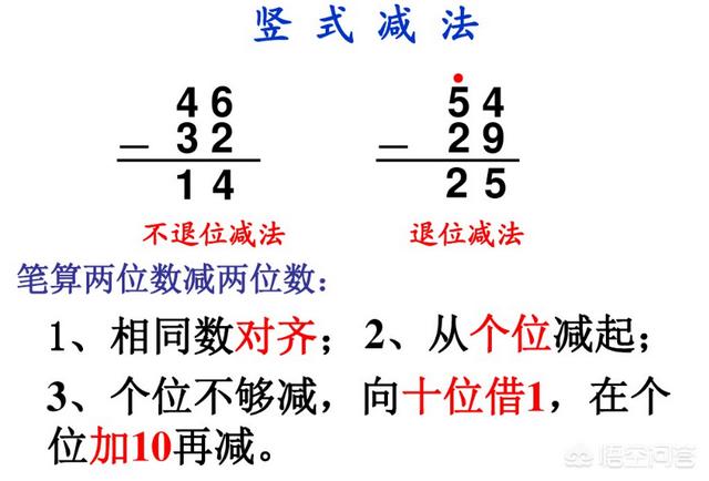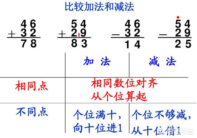 看上图。有没有发现这样列竖式进行计算非常简单。把相同数位对齐后。它就变成了20以内的加减法了。如果20以内的加减法掌握的非常牢靠。这还有啥难度可言。不过做加法时。提醒孩子一定要记得满十进一。这个会有小孩子忘记做错。做减法时切记在十位上借走了一个。这时十位就会少一。可是很多孩子借了位。也记不住去掉一。