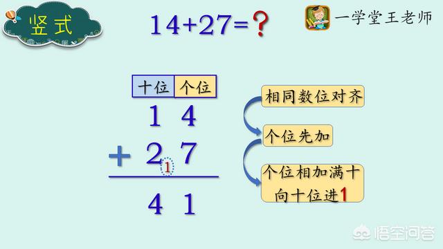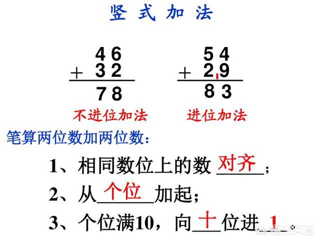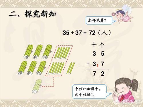 两位数加法理解到竖式计算过程及注意点。数位对齐。个位起算。进位退位(20以内加减法基础)。理解是前提。建议通过图中计数小棒或算珠去实际操作。