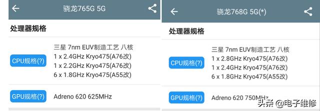 骁龙768处理器和骁龙765G在结构上没有一点变化。同样采用1+1+6的CPU设计。同样的Adreno 620 GPU。同样的三星7nm EUV工艺。并且同样集成了高通X52基带。不同的只是CPU频率和GPU频率。请看下图。