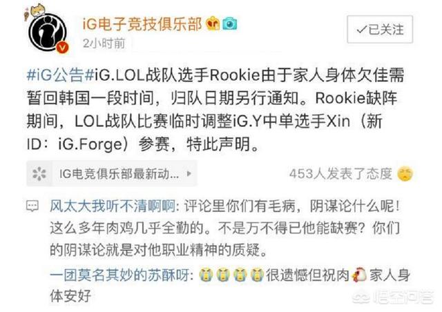 有网友注意到Rookie早上7点钟还在打RANK。下午16点战队就出了公告。说明此事实属突发情况。个人认为Rookie此时的离开确实属于逼不得已。毕竟这几年来Rookie才是IG战队的基石选手。Rookie不仅技术实力拔尖。而且情商颇高为人低调。声呐不相信他会得罪队友或管理层。希望Rookie家人能早日康复。Rookie也能早日回到赛场。