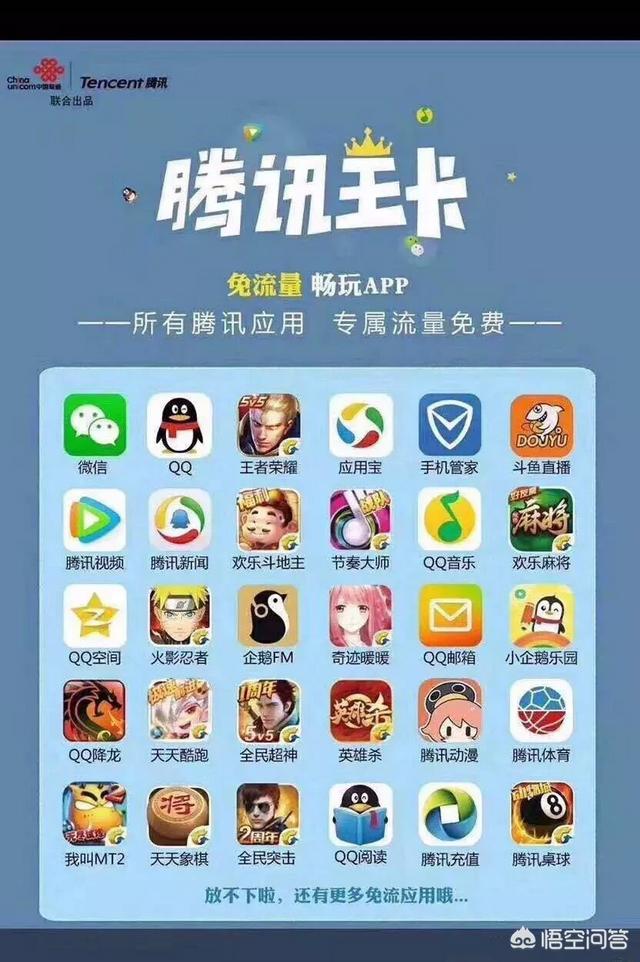 4、腾讯大王卡是联通最热门的一款互联网套餐。每个月19元的月租就可以免流量使用腾讯旗下所有的应用软件。微信已经完美的融入了我们的生活当中。有事没事发发微信问候一声。交流一下功能等。联通公司也是因为腾讯大王卡套餐吸收了众多的4G手机用户。