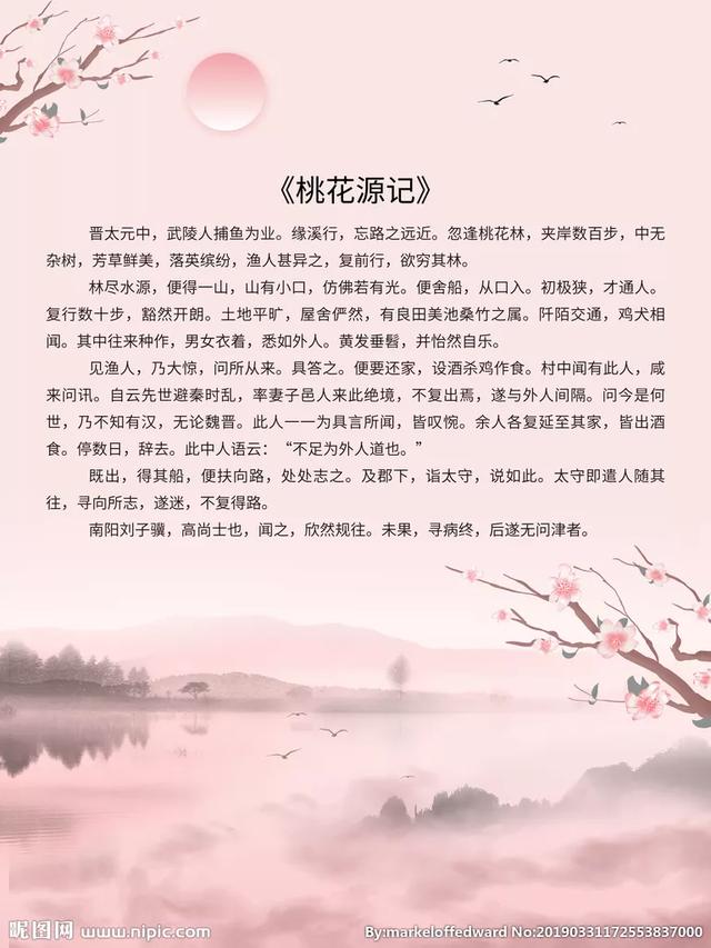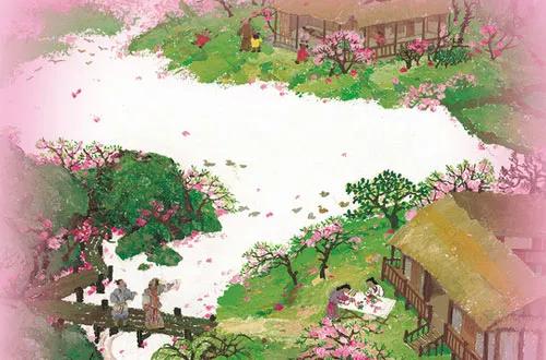 在原文中。一位经常在水上打渔的渔夫。竟然在捕鱼的过程中迷了路。被一片茂密的桃花林挡住了去路。在桃林的尽头有一座小山。渔夫从一处闪着光的小洞口中进去。就看到了一个让人惊叹又无限向往的世外桃源。