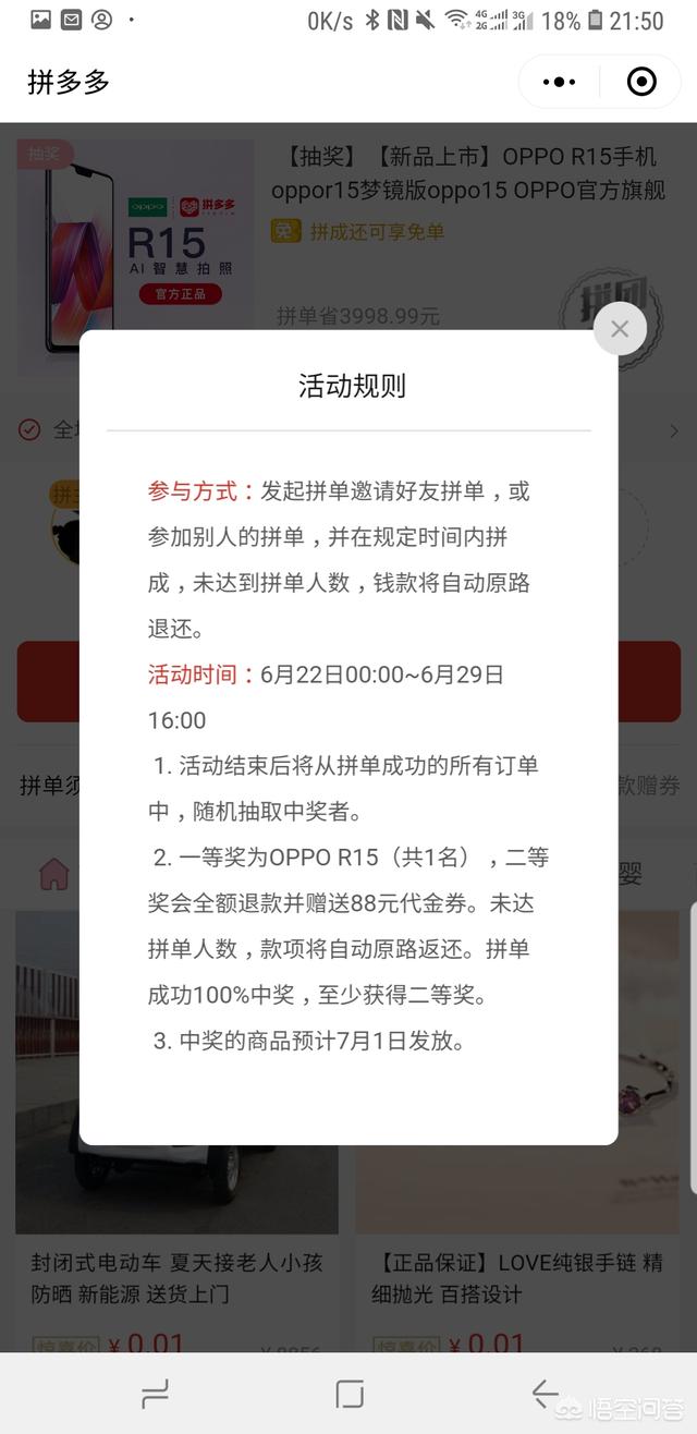 从所有拼单成功的订单中抽取一个一等奖。奖品是OPPO R15。