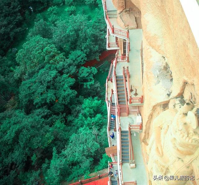 麦积山石窟虽然是四大石窟中最不知名的。但是是建筑难度最大的。最高处栈道位于麦积山顶部。距地面垂直距离约300米。参观所有洞窟均需要进入栈道。