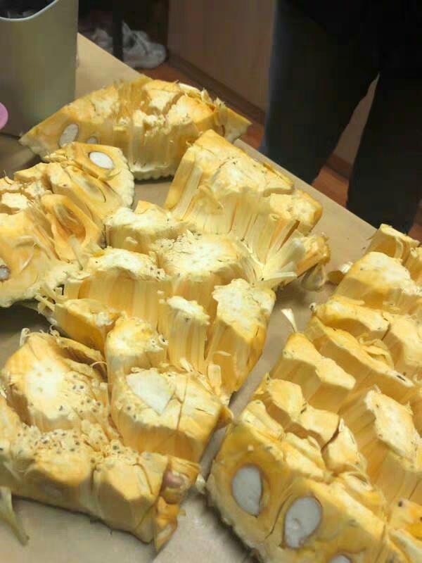首先准备。桌子上放上报纸或者纸。防止粘液粘到桌子上。刀和手上抹点色拉油就行。吃过的你懂的为什么吧。准备好直接用刀把一个菠萝蜜切成4块厚片。如图所示