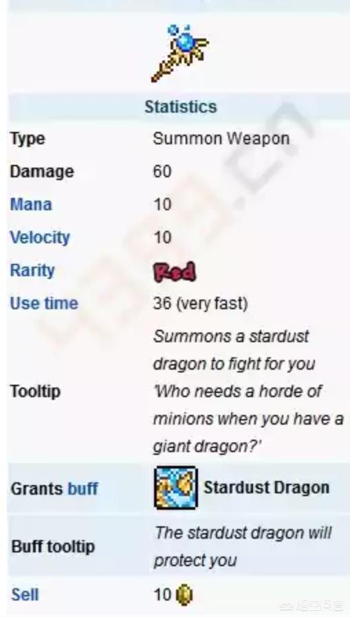 打败四神柱之一的——星辰塔掉落星辰碎片。在上古工作台旁边合成。召唤一只星辰龙为你而战。有60的基础伤害。穿上召唤师套能达到100多。每次使用会加一截而不是多一条龙。每加一截龙的伤害提升大约100%。“当你拥有一条强大的龙之后。你还需要一群召唤物吗?”最好品质为“神话”。