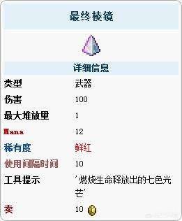 杀死最终BOSS——月神克苏鲁后有概率掉落基础伤害100。穿上法师套可以达到300多。开始是散射的光线。可以清理小怪。最终聚能后变成一道彩虹光线。伤害奇高(但是这把武器特别耗蓝)。用来打入侵的不二之选。“超神”为最强的品质