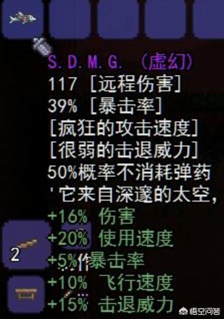 依旧是杀死月神克苏鲁概率掉落。穿上射手套能达到100多。伤害和射速碾压1.2最强的链条枪。而且有50%概率不消耗弹药。可以节省一些珍贵的子弹。是巨兽鲨的终极强化版。最好品质为“虚幻”