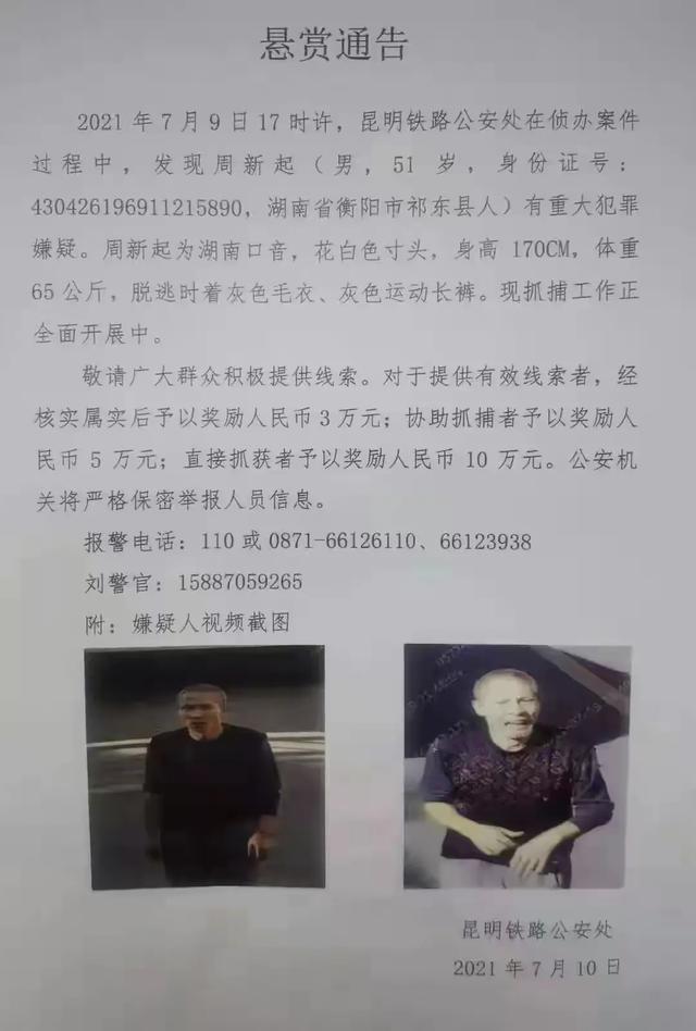 这个周新起到底犯了什么罪呢。他是一个湖南籍的犯罪嫌疑人。犯的罪在前段时间公开的审判内容来看是贩毒。既然已经审判。为什么又被悬赏抓捕呢。这个已经很多人能想得到。他应该是潜逃被通缉。而且因为在云南昆明的地界上面出现。所以铁路公安为了抓住犯罪分子保护人民群众的安全。直接进行围堵抓捕。并提供悬赏令让群众配合。